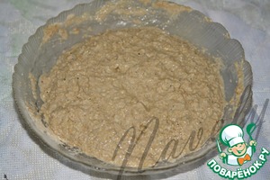 Должно получиться вот такое, липкое тесто, не слишком крутое, но и не жидкое. Накрываем его пленкой и оставляем примерно на 1 час, отдохнуть. За это время отруби набухнут, и тесто станет более густым.