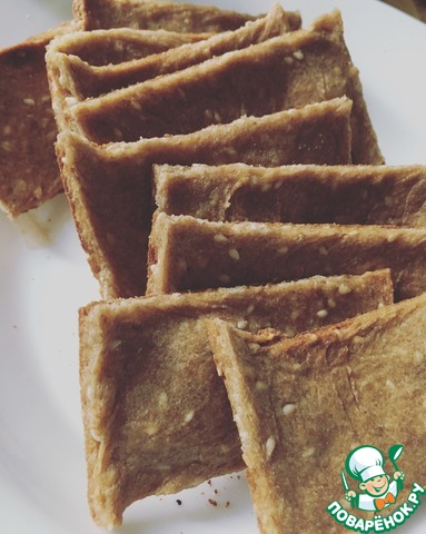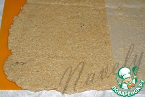 Раскатываем тесто через бумагу до толщины 3-4 мм, если хотите более хрустящие хлебцы, можно раскатать до 1-2 мм.