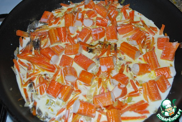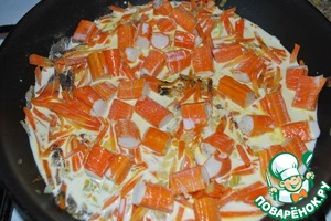 На крупные кусочки режем крабовые палочки. И выкладываем их поверх овощей. Прогреваем минуты 3.