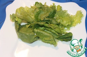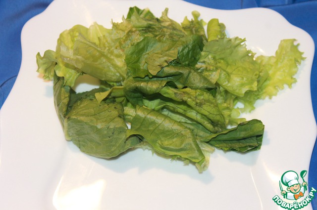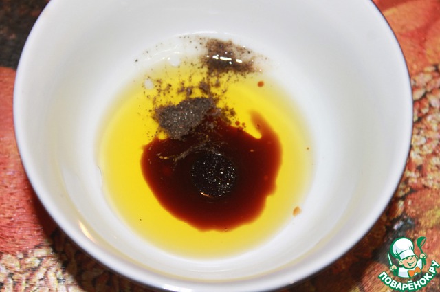 Приготовить заправку для салата: смешать оливковое масло, черный перец и бальзамический уксус и полить салатные листы