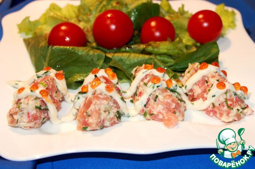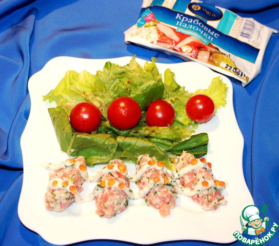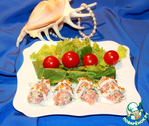 Рецепт «Риет из крабовых палочек и малосольного лосося с икорным соусом»: