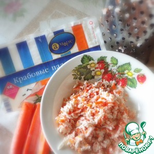 Одну пачку крабовых палочек натираем на крупной терке. Я заранее, минут за 20, помещаю крабовые палочки в морозилку, так их легче натереть.