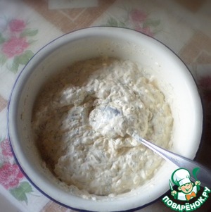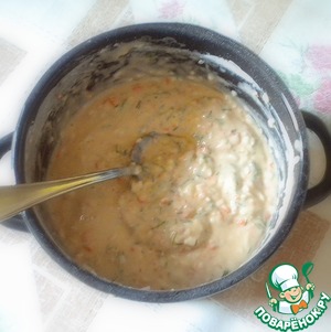 К яйцам добавляем примерно полтора стакана муки, натертые крабовые палочки, немного мелко нарезанного укропа и 3 столовые ложки постного масла. Все перемешиваем, чтобы не было комочков. Тесто получается густотой как на шарлотку.