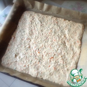 Противень застилаем пекарской бумагой и тонким слоем распределяем по всей поверхности наше тесто. Отправляем в разогретую до 180 градусов духовку до готовности (минут на 20).