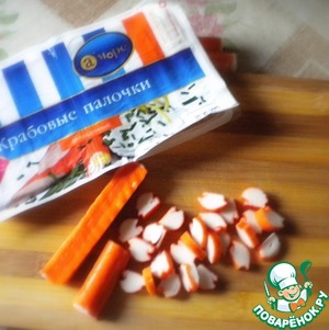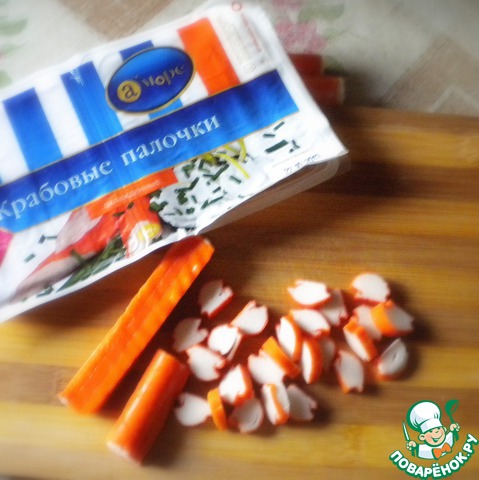 Оставшуюся пачку крабовых палочек нарезаем кружочками. |