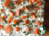 На верх торта выкладываем небольшие кусочки семги и посыпаем оставшимся укропом. |