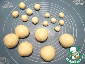 С помощью кухонных весов взвешиваю 6 кусочков теста по 10 грамм, 6 кусочков теста по 4 грамма. Оставшееся тесто делю на 6 равных частей.