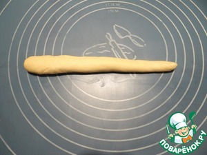 Из самого крупного кусочка теста формую жгут таким образом, чтобы он утолщался к одному краю.