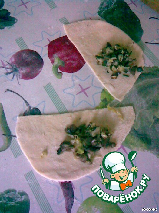 Каждый кусочек раскатать лепешкой и ее порезать пополам.