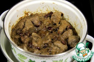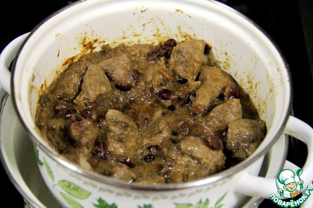 Затем кастрюлю с мясом ставим сверху большей кастрюли с кипящей водой, закрываем крышкой и готовим на пару до готовности мяса. |