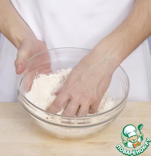 Отделить белок от желтка. Масло заранее охладить. Смешать муку с миндальной крошкой, сахаром, ванильным сахаром и солью. Добавить нарезанное маленькими кусочками масло и желток. Вымесить тесто. Завернуть тесто в пленку и поместить в холодильник минимум на 1 ч. -