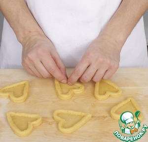 На присыпанной мукой поверхности раскатать тесто в пласт толщиной 0,3 см. Специальной формочкой вырезать из теста сердечки. Из половины получившихся сердечек аккуратно вырезать середину, оставляя края шириной 0,5 см. Одну сторону смазать слегка взбитым белком.