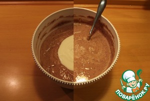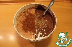 Добавляем какао и аккуратно перемешиваем ложкой и вливаем оставшиеся 100 гр йогурта.