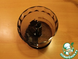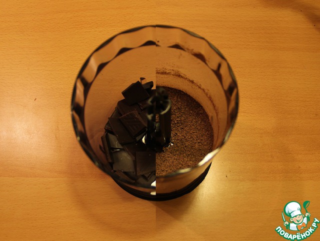 Достаём шоколад из морозилки и мелем в порошок в блендере.