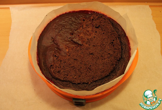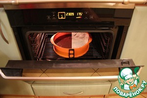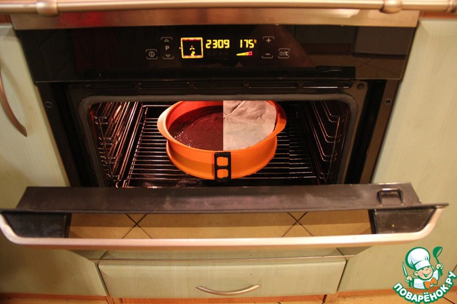 Отправляем в разогретую до 175*С духовку на 35-40 минут. После 10 минут накрываем бумагой для выпечки - это не позволит нашему коржу лопнуть.