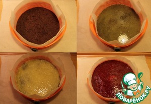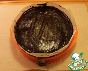 Выстилаем бумагой бока и вкладываем нижнюю часть коржа.