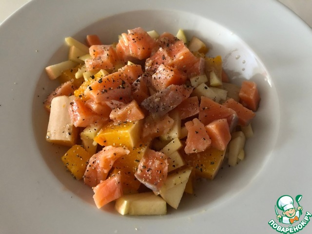 Описание: В этом салате сочетаются, на первый взгляд, несочетаемые продукты, но в этом его прелесть. Нежный, сочный и красочный и при этом очень полезный. Этот салат - кладезь витаминов.