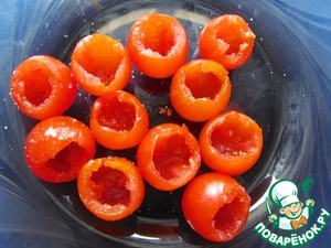 Помидорки вымыть, срезать верхушки и кофейной ложкой аккуратно вынуть сердцевину.