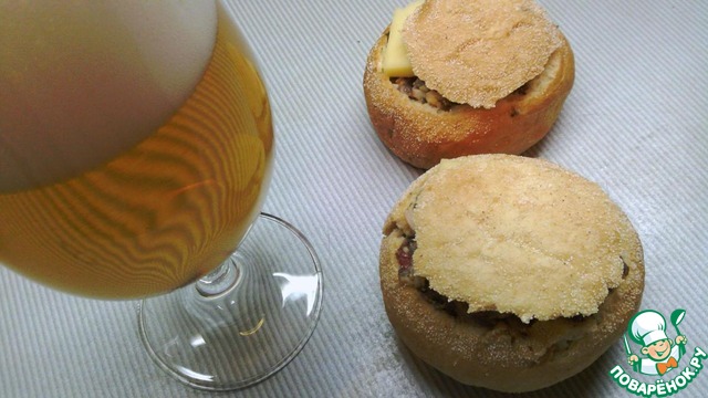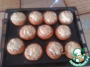У булочек аккуратно срезать верхушку и вынуть середину, оставляя не слишком тонкие стенки. Можно сразу поставить на противень.