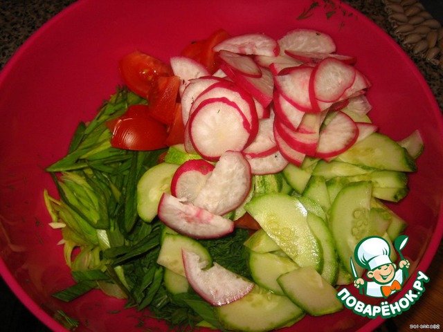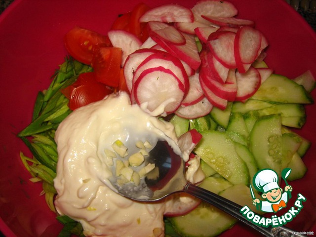 Вкусный летний салат! Использовала салатный микс, сметану не добавляла. Только масло. Спасибо большое за рецепт!