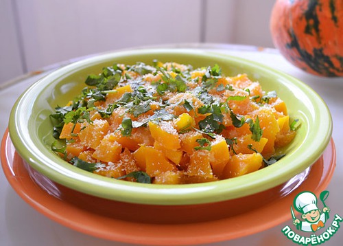 Поливаем тыкву соусом. Посыпаем кокосовой стружкой.
