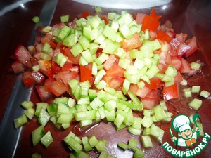 Мелким кубиком нарезаем помидор и огурец.