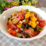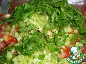 Нарезаем также мелко остальный ингредиенты: перец, зелень. Лук нарезаем мелким кубиком и замачиваем в воде с уксусом (1 стакан воды - 1 ст. л. уксуса). Воду сливаем, лук слегка отжимаем и добавляем в салат.
