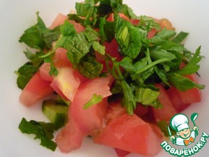 Также мелко режем петрушку, мяту. Добавляем к овощам