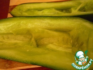 Подготовим огурец, чтобы заправить в него салат. Разрезаем огурец вдоль, вырезаем мякоть.