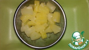 Кусочки ананаса откинуть на ситечке, чтобы стёк лишний сок.