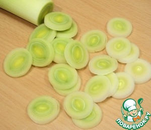 Лук-порей нарезать. Стебель режем кружочками, листья тоненькими полосочками.
