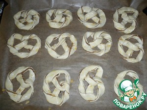 Нарезанные полосочки скрутить жгутиком, потом оба конца перекрутить один раз между собой и сформировать брецельку! Фото неудачное получилось, но так понятнее!