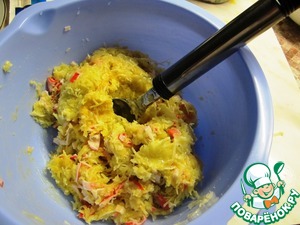 Картофельное пюре смешать с яйцом, сыром, крабовыми палочками, специями, солью.