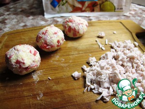 Шарики обвалять в нарубленной белой части крабовых палочек.