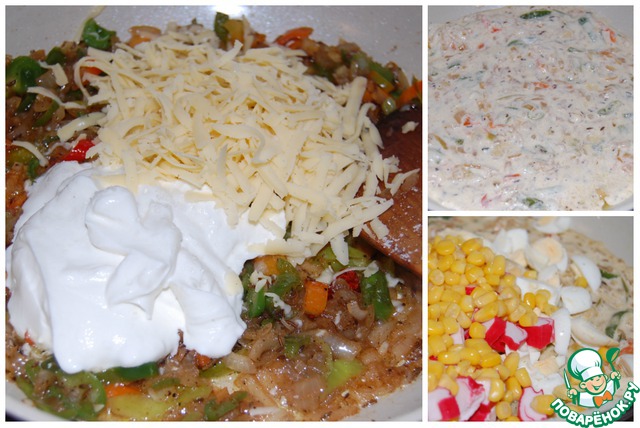 Вмешайте сметану и половину сыра. Дайте прогреться сметане с сыром и снимайте с огня. Добавьте яйца, кукурузу и палочки. Тщательно вымешайте, начинка готова.