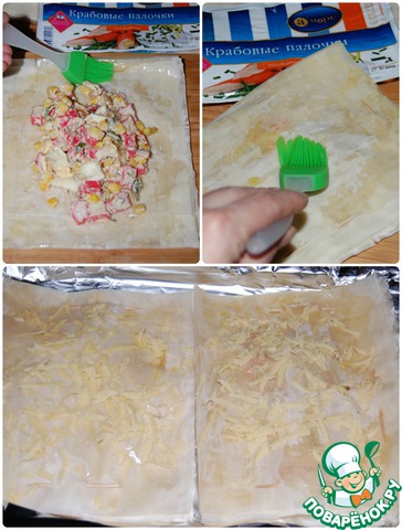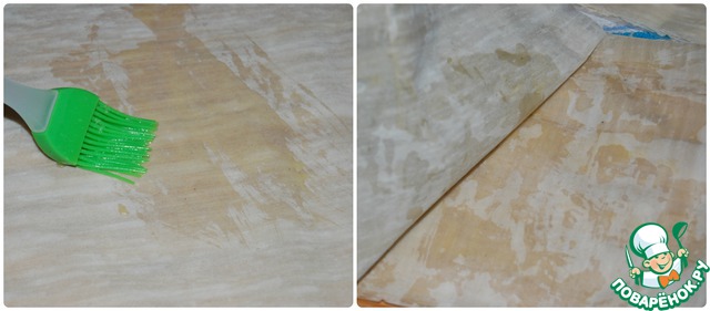 Тесто фило смажьте растопленным сливочным маслом. Сверните пополам, ещё раз смажьте маслом.