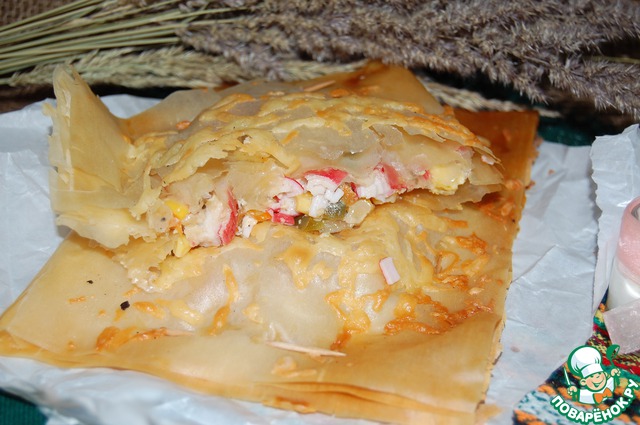 На половину листа выложите начинку и закройте второй половинкой. Скрепите зубочистками.