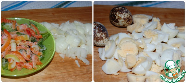 Лук, перец, мелко порежьте. Перепелиные яйца отварите, очистите и порежьте на четвертинки. Крабовые палочки нарежьте на кусочки, примерно, в сантиметр.