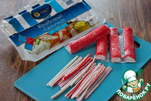 Крабовые палочки разморозить и нарезать тонкой соломкой.