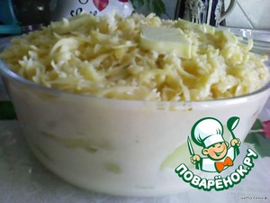 Картофель и яйца уложить слоями в огнеупорную посуду, залить соусом, засыпать тертым сыром, сверху положить несколько кусочков масла.