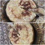 Все шло хорошо, до момента добавления начинки. Начинки по рецепту получается 300грамм, и тесто из одного неполного стакана муки и одного неполного стакана жидкости начинку даже не покрыло полностью.