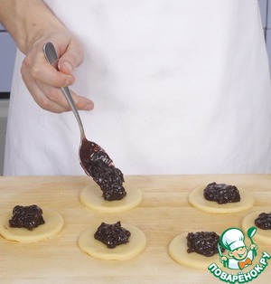 На присыпанном мукой столе раскатать тесто в пласт, вырезать из него круги диаметром около 7 см. В середину каждого круга положить по 1–2 ст. л. начинки.