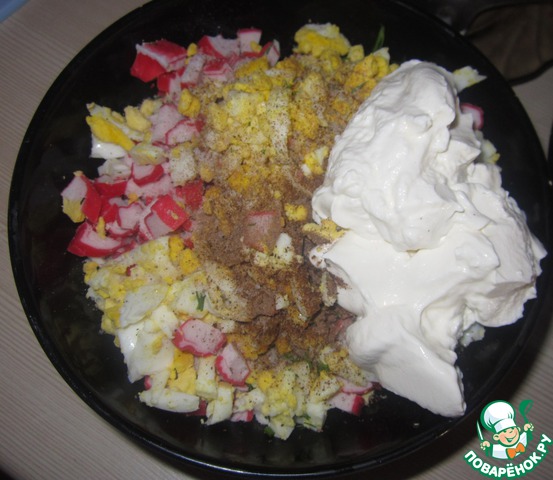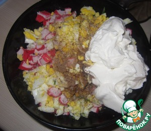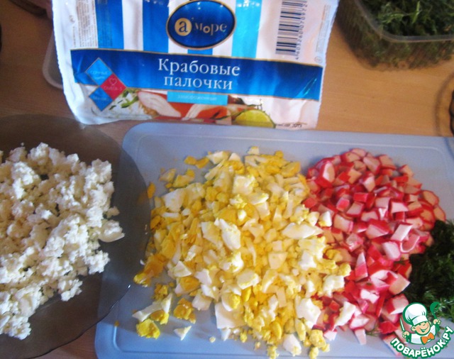 Яйца, крабовые палочки, укроп измельчить. Сыр размять вилкой или натереть на терке.