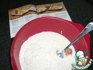 Муку, яйца, молоко, соль и творог, в любом порядке добавить в большую чашку!