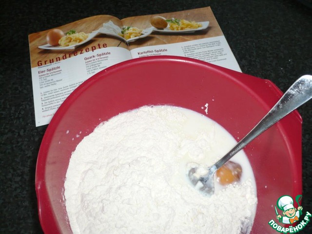 На кастрюлю с кипящей, подсолённой водой положить форму для шпецле (тёрку или дуршлак с большими дырочками)!