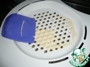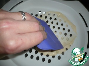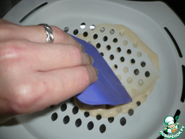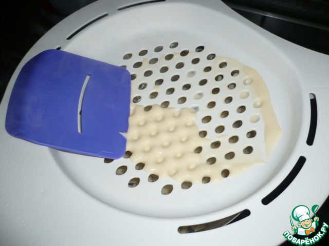 Тесто порционно выливать в форму! Медленно, с помощью лопаточки, продавливать тесто, через дырочки! Теста должно быть больше в форме, чем у меня! Пока фоткала, всё тесто уже в кастрюлю убежало!