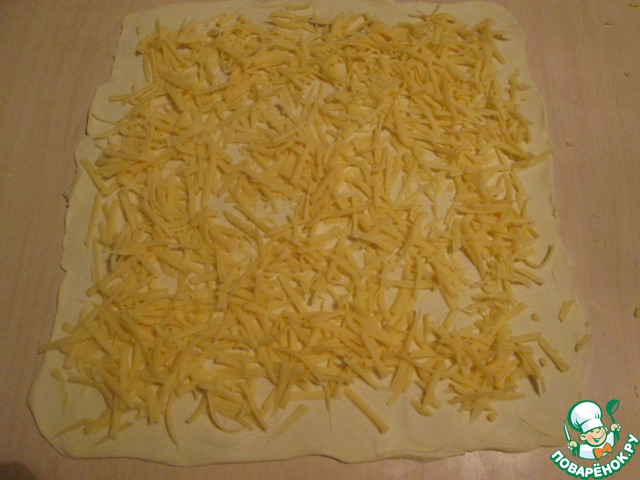 Слоёное тесто раскатать в тонкий пласт и посыпать тертым сыром.