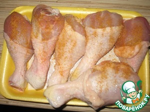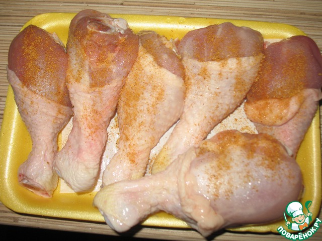 Куриные голени тщательно вымыть, посолить, посыпать приправой для курицы.
