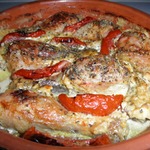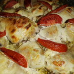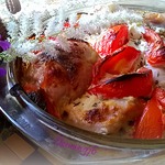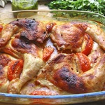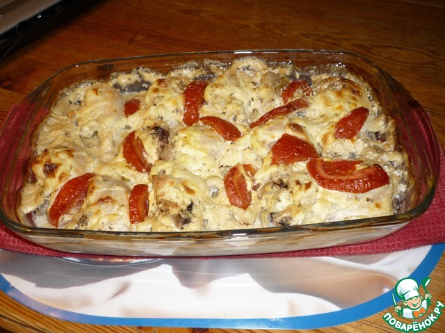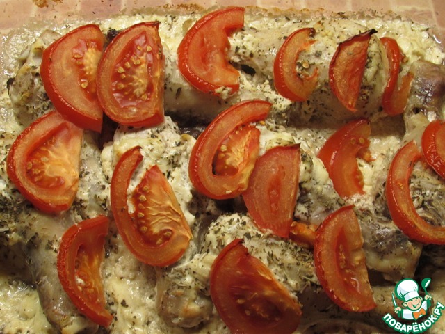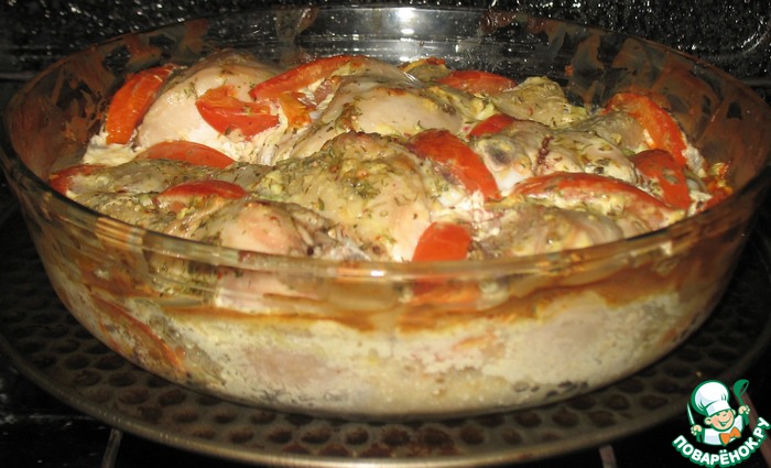 Обложить курицу порезанными помидорными дольками и поставить запекаться на час (до появления румяности).