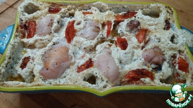 Уложить в сметанно-чесночный соус, чтобы он полностью покрывал всё мясо, посыпать прованскими травами.
